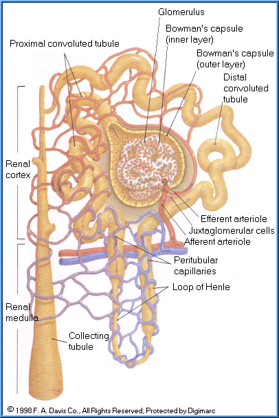 Elimination of substances by the kidneys into the urine is the primary route of excretion of toxicants. The primary function of the kidney is the excretion of body wastes and harmful chemicals. The functional unit of the kidney responsible for excretion is the nephron. Each kidney contains about one million nephrons. The nephron has three primary regions that function in the renal excretion process, the glomerulus, proximal tubule, and the distal tubule. These are identified in the illustrations.