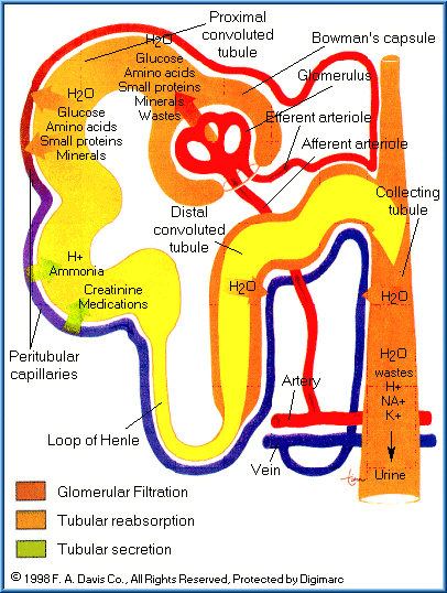 Reabsorption takes place mainly in the proximal convoluted tubule of the nephron. Nearly all of the water, glucose, potassium, and amino acids lost during glomerular filtration reenter the blood from the renal tubules. Reabsorption occurs primarily by passive transfer based on concentration gradient, moving from a high concentration in the proximal tubule to the lower concentration in the capillaries surrounding the tubule.